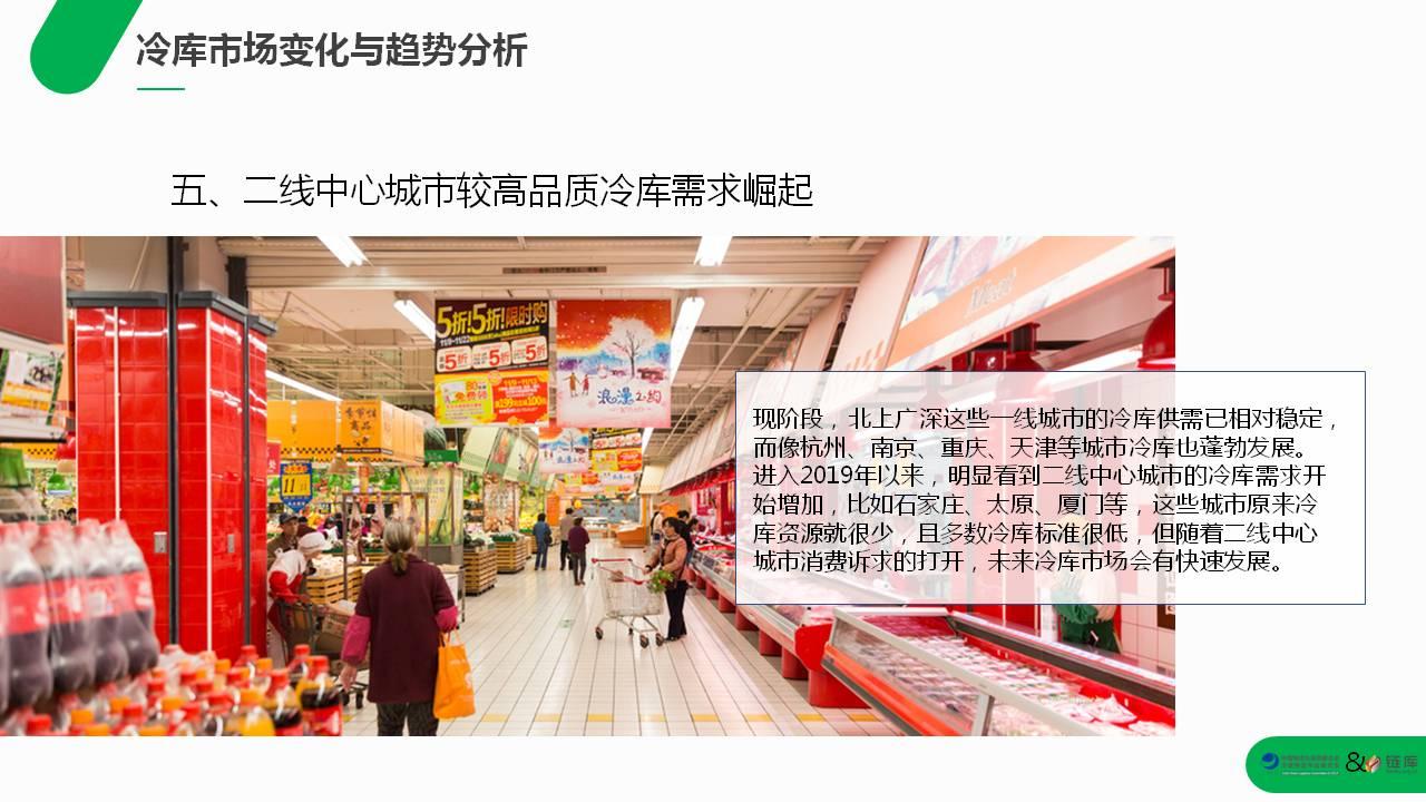 現階段,北上廣深這些一線城市的冷庫供需已相對穩定,而像杭州、南京、重慶、天津等城市冷庫也蓬勃發展。進入2019年以來,明顯看到二線中心城市的冷庫需求開始增加,比如石家莊、太原、廈門等,這些城市原來冷庫資源就很少,且多數冷庫標準很低,但隨著二線中心城市消費訴求的打開,未來冷庫市場會有快速發展。