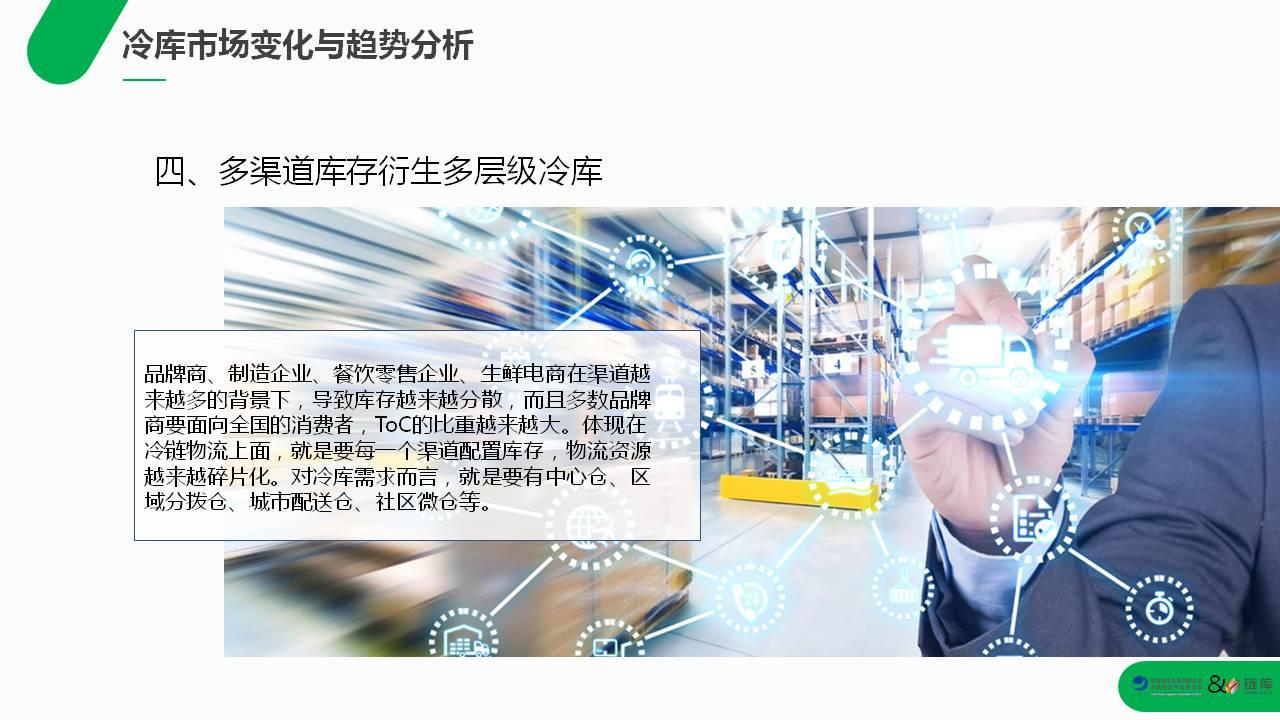 品牌商、制造企業、餐飲零售企業、生鮮電商在渠道越來越多的背景下,導致庫存越來越分散,而且多數品牌商要面向全國的消費者,ToC的比重越來越大。體現在冷鏈物流上面,就是要每一個渠道配置庫存,物流資源越來越碎片化。對冷庫需求而言,就是要有中心倉、區域分撥倉、城市配送倉、社區微倉等。
