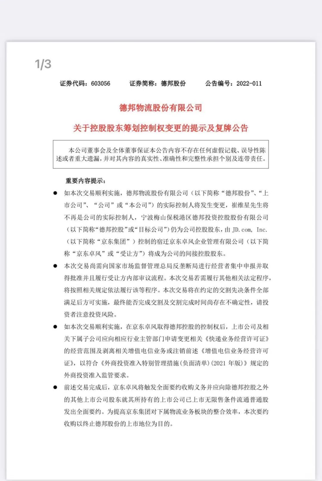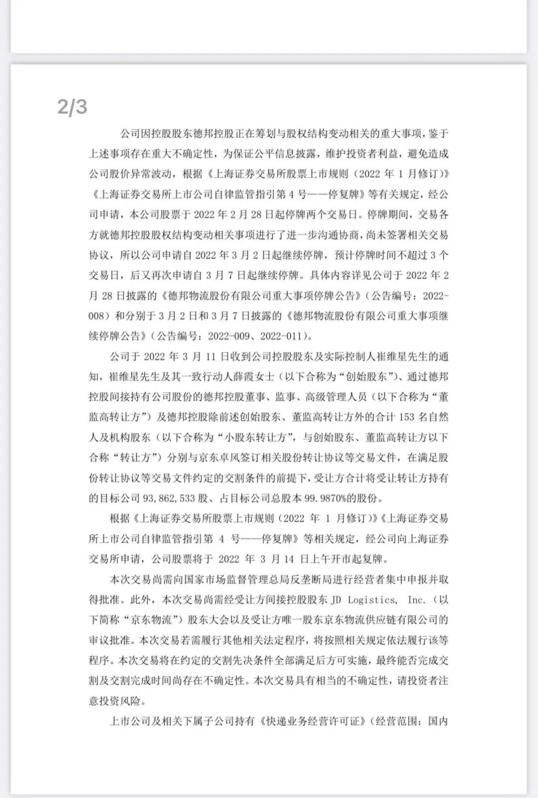 在經歷9個工作日的漫長停牌后,今天(3月11日),德邦快遞終于發布公告,正式官宣與京東物流戰略合作。公告顯示: